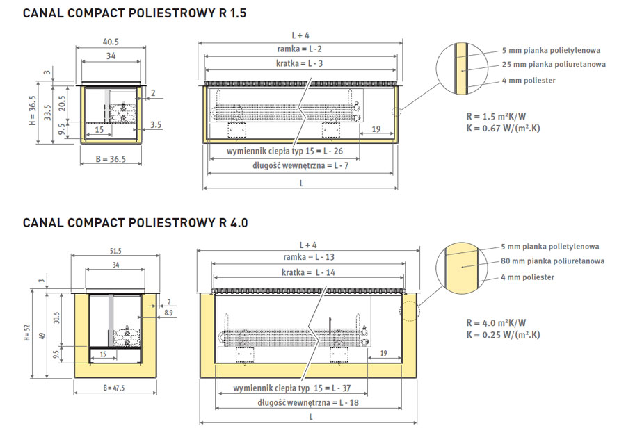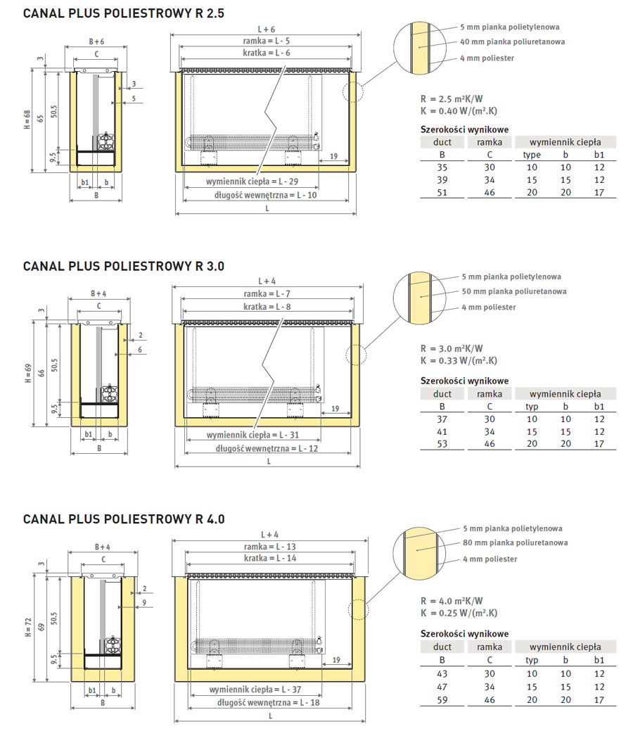 1. Mocne i odporne na wilgoć koryto grzejnika, wykonane z najlepiej izolujących materiałów. Zewnętrzna warstwa 5 mm poliestru, wewnętrzna 4 mm pianki polietylenowej oraz wypełnienie gęstego z poliuretanu o grubości zależnej od współczynnika izolacyjności cieplnej R. Dostępne grubości ścianki koryta od R=1.5 m²K/W do R=4.0 m²K/W